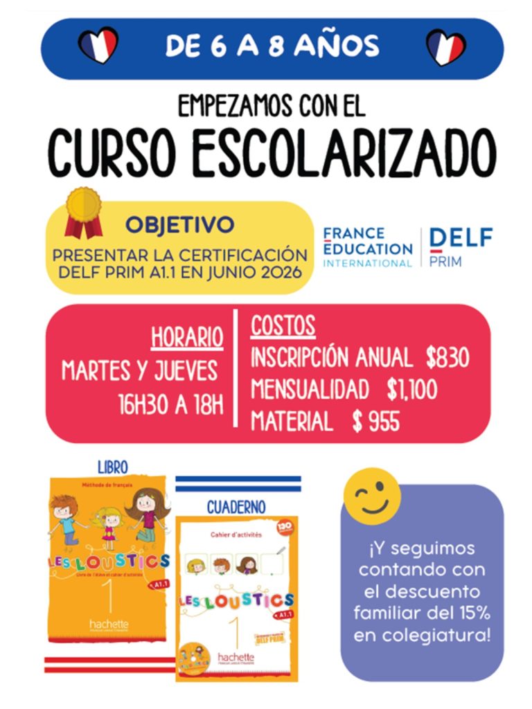 Nuestros cursos para niñas y niños están diseñados para que aprendan francés de forma lúdica, dinámica y eficaz, desarrollando habilidades lingüísticas desde temprana edad. Con una estructura anual clara y certificaciones internacionales, podrán avanzar paso a paso en el idioma.
