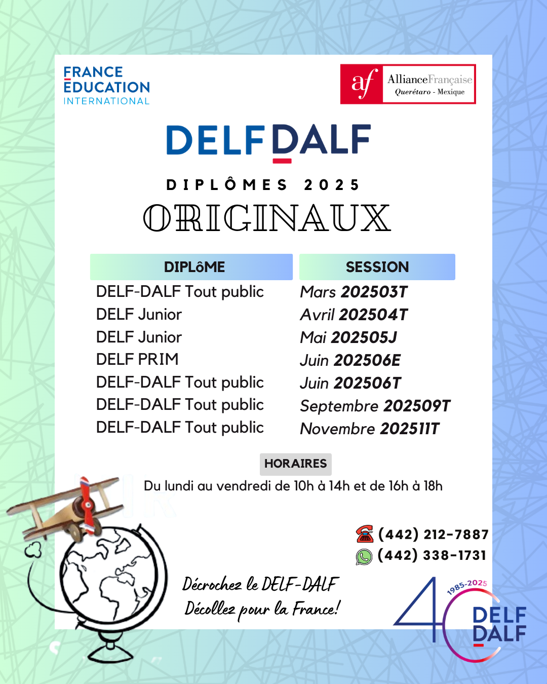 - En el caso de acreditar tu DELF-DALF, acude por tu Constancia de acreditación directamente a nuestras instalaciones de LUNES a JUEVES de 10h a 14h y de 16h a 19h, VIERNES de 10h a 14h y de 16h a 18h. Éste documento funge como certificado provicional mientras llega tu documento original. Éste último tarda de 4 a 6 meses despues de la publicación de resultados.